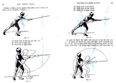 The art of teaching the Art of the quarterstaff was still strong in the 18th and 19th centuries, especially among the boy scouts (see image above left). One fairground version of quarterstaff play was fought on a narrow plank of wood, over a river or stream, the idea was to thrust rather than knock your opponent into the water. The quarterstaff also had it's place in judicial combat, the defeated party being supposed as the guilty party.