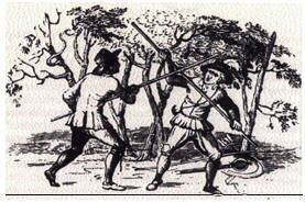 Research into English Martial Arts can, and is sometimes a very frustrating experience. But we have evidence from literary and Archaeological sources on many of the weapons and techniques used. It is known through these sources that the English warrior, and even everyday men and women used systematic training. They trained in an art probably already ancient to them, which had and has well understood combat moves that were part of a known fighting system. Literary and visual sources give many valuable clues as to weapons and techniques. Quarterstaffing is an ancient form of English stick fighting, and crosses all social boundaries. It is found from earliest times, throughout the middle ges, and into the 15th, 16th, 17th, 18th, 19th and 20th centuries.