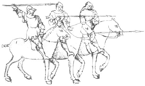 The mounted warrior, unlike his comrade on foot, has a very limited opportunity to strike at his opponent. The horses pass one another with such speed that the horseman must deliver his attacks in swift succession. These attacks usually involve thrusts from the front when approaching the opponent, combined with backwards cuts when passing him by. The primary weapon was the lance, because of its range and penetration.