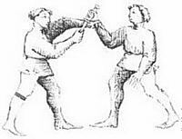 In most of the illustrations, the victor is designated by a black garter around one of his legs. More often than not, the victorious fighter is an older man with a forked beard, wearing a cloth headband. Since medieval fencing masters commonly posed for their own manuals, this bearded swordsman most likely represents Maestro Fiore himself. A more complete description of this manual appears in an appendix at the end of this article.