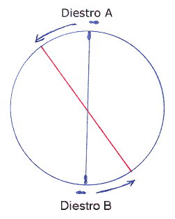| Diestros A and B stand at opposite ends of the diameter. To insure a safe position Diestro B responds by moving and maintaining the diameter. Red line is the new diameter. |