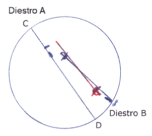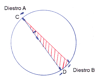 | Diestro A stops at point C while Diestro B continues moving, thus creating the opening for Diestro A to attack at an angle. Diestro A steps in at an acute angle along chord CD. Red lines indicate the acute angle. |