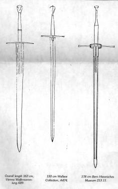 Evidence for the weight of these swords – obviously a relevant factor in assessing their manoeuvrability and controlability – is imprecise where swords have lost their grip-coverings and are corroded. Nevertheless the dividing line between two-handers and lesser swords seems to be around two kilograms – most hand-and-a-half swords are below that weight and almost all two-handers are above it. That is also the weight at which single-handed control of a long sword becomes very difficult. The ideal weight for a two-hander seems to be between 2.5 and 3.5 kilograms. Since the balance is usually good – about 10 cm down the blade from the cross – such a sword is amenable to skilled control. Where the sword is over 4 kg (examples up to 6 kg are known) continuous use would soon exhaust the wielder. It is also interesting to notice that the length of the hilt, as a proportion of the whole sword, increases from a sixth or seventh in the case of ordinary fourteenth-century swords to a quarter or fifth on earlier two-handers to a third on some late, very large German two-handers.