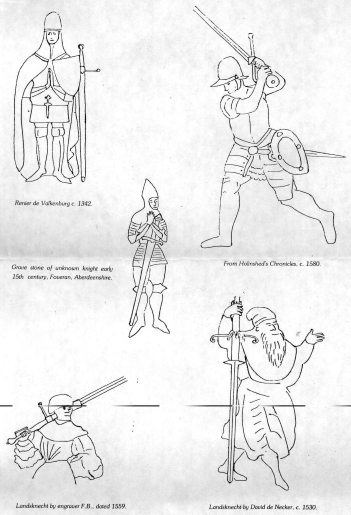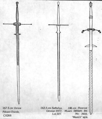 Certainly the Swiss had adopted the two-hander by the fourteenth century, but so had Germans, Italians, Burgundians, French, Scots and knights of the Military Orders. We know that the Swiss, Burgundians, Venetians and later the German Landsknechts used it as a regulation weapons; to what extent any of the others did is not clear. Probably the difficulty of its manufacture and greater price in comparison with staff weapons precluded its widespread acceptance.