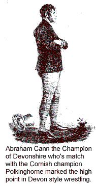 In 1826 a huge challenge match between the Cornish Champion Polkinghorne and the Devonshire Champion, Abraham Cann. Cann was permitted to wear one shoe and was said to have kicked mightly on that day. It is unclear who won that match with the judges calling it a draw and the spectators from the various camps claiming victory for their sides. The style of Devonshire seemed to be losing steam by this time and within a century was all but forgotten while the Cornish style hung on by a slender thread.