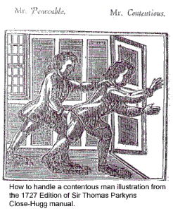 In 1713 a man by the name of Sir Thomas Parkyns wrote the first manual entirely devoted to wrestling in the English language, "The Inn-Play or Cornish-Hugg Wrestler". Parkyns Close-hugg style differs greatly from the modern sport of Cornish wrestling. It is much more combative in nature yet it does contain some of the same throws such as the flying mare and cross-buttock. It seems to not only deal with the sportive aspects of the style but also with self defence as well. Defences against lapel chokes and several other attacks are included as well as a section about which of the Close-Hugg moves to use while boxing. There is also a small section on how to deal with a contentous man which shows the old bartender favorite of grabbing a person by the collar and back their pants to escort them to the door.