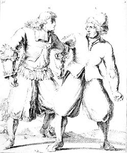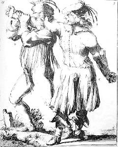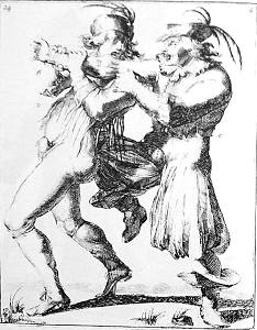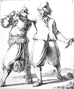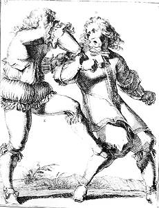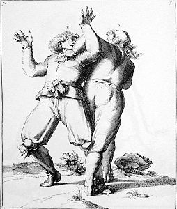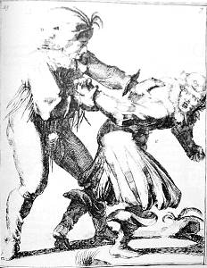 K grips L by the throat, and L, throwing off his hat, turns over his head