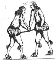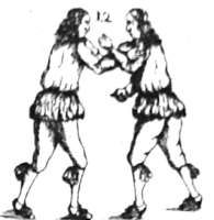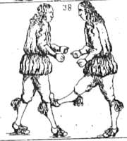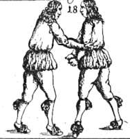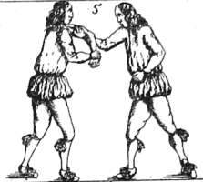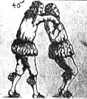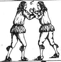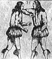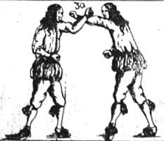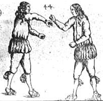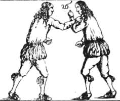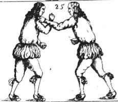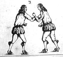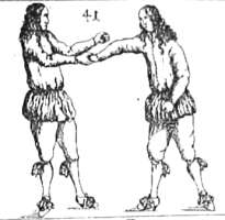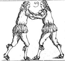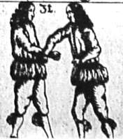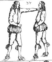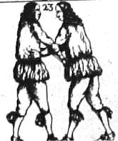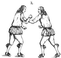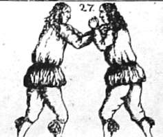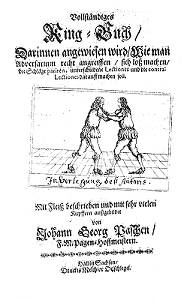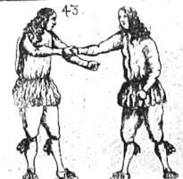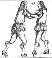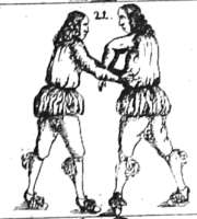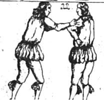 This is an interesting little 17th century wrestling manual, with focus on unarmed defence, and surprisingly complete in the types of techniques covered. It is also boringly repetitious and the explanations are not extraordinarily clear. The clarity is not improved by a paragraph numbering scheme that doesn't match the picture numbers, and the hard to read, fraktur-style typeface. I have omitted the paragraph numbering as I found it more confusing than helpful. The original has the pictures grouped, I have placed them with the relevant paragraphs.