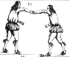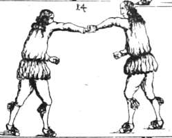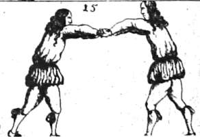When Adversarius has taken hold of both your sides with both hands, so free yourself inwards with both hands, as in N° 18.