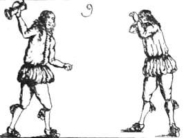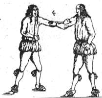 When Adversarius wants to throw a jar or some such at you, advance towards him with your arms crosswise, covering your head, as in N° 9.
