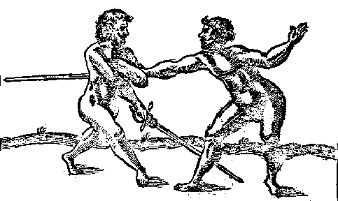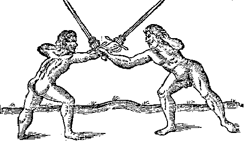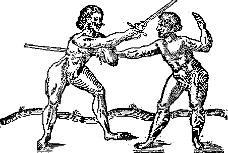 Or when he lets his point sink down into a Quarte, then lift thy point over his weapon towards thy left side, and Passere him with a Secunde at the outside of his weapon, at his right thigh.